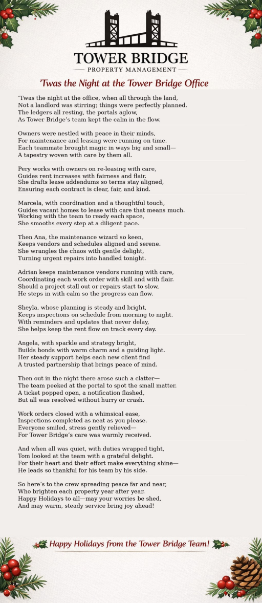 As we come to the close of the year, it’s a meaningful time to pause and reflect on the people, partnerships, and shared efforts that make property management successful. To mark the season, we’ve created a short poem celebrating the work our team does every day—an expression of appreciation for the care, coordination, and commitment behind each property we manage.